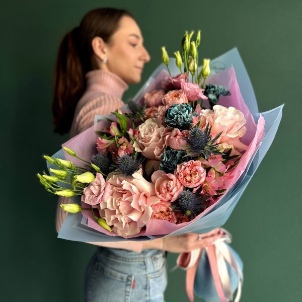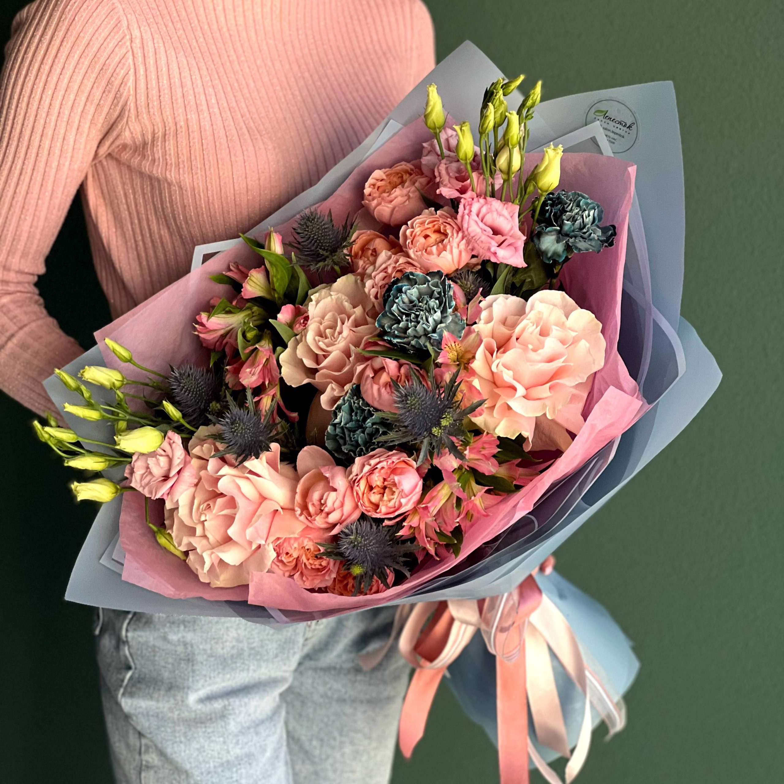 Букет из французских роз, гвоздики Неви и эрингиума в Ишиме